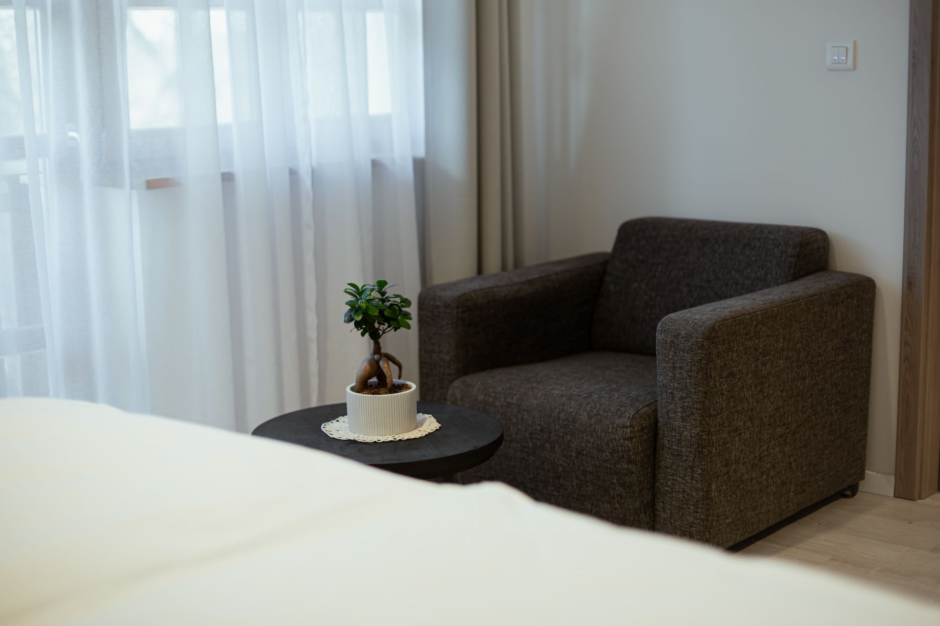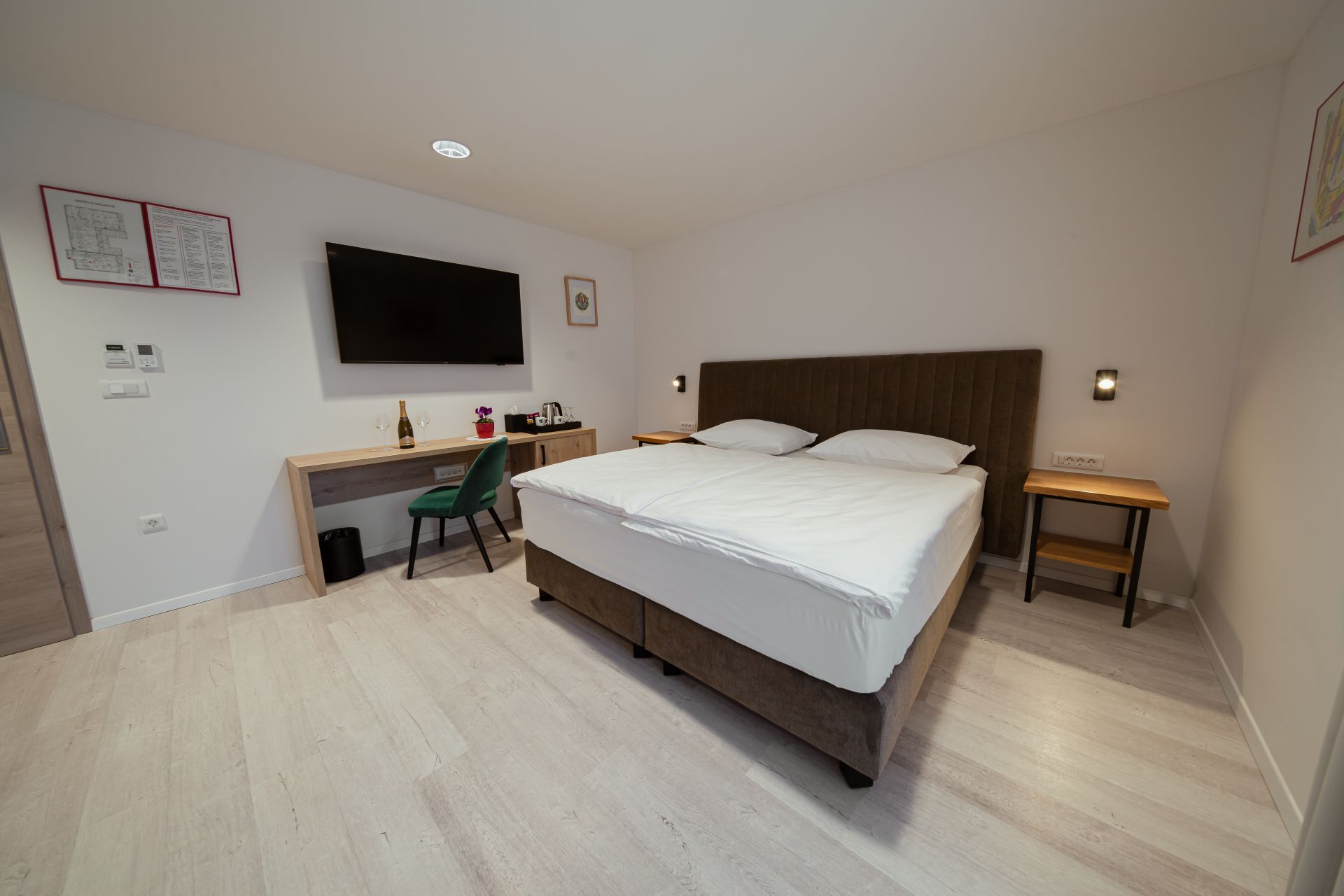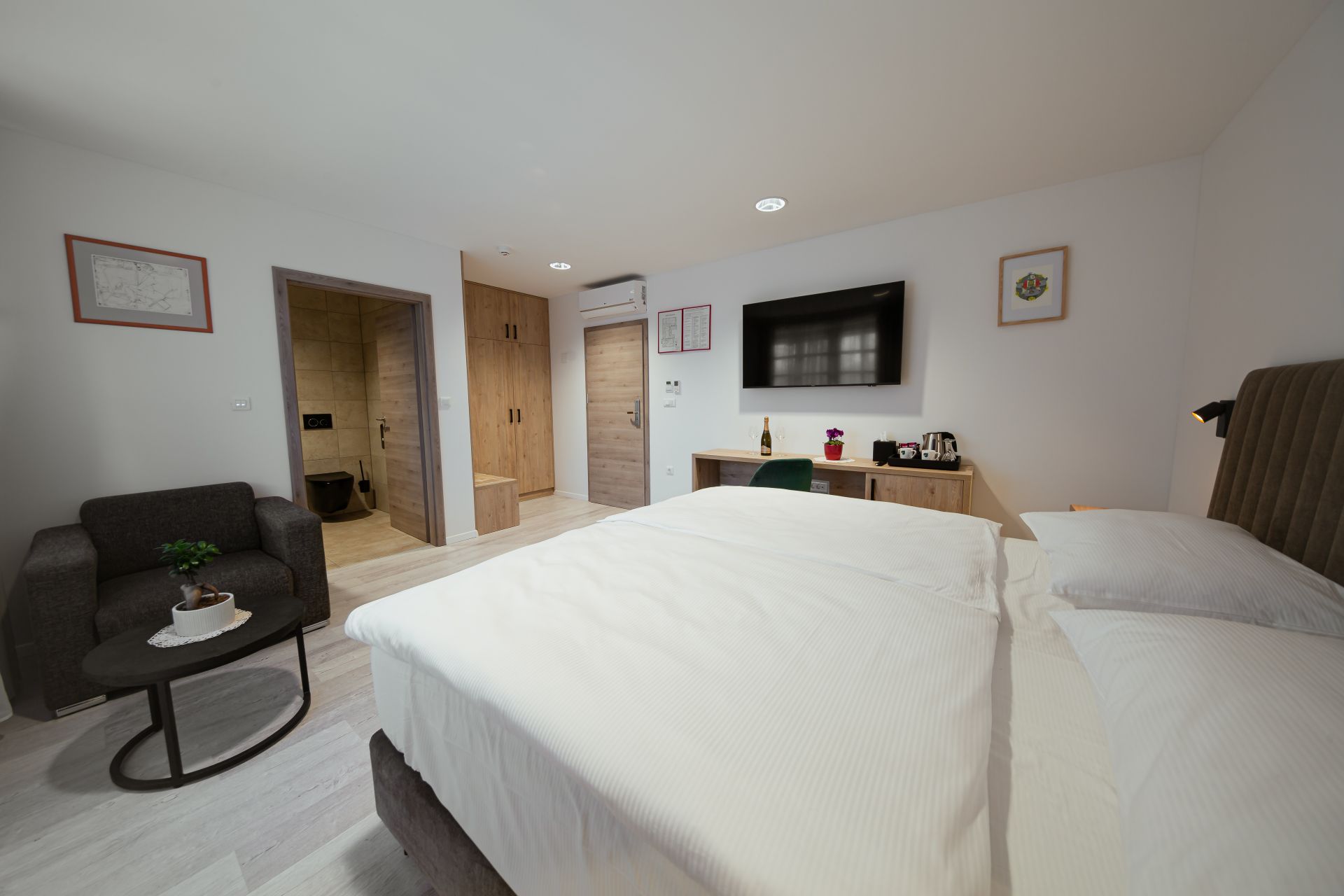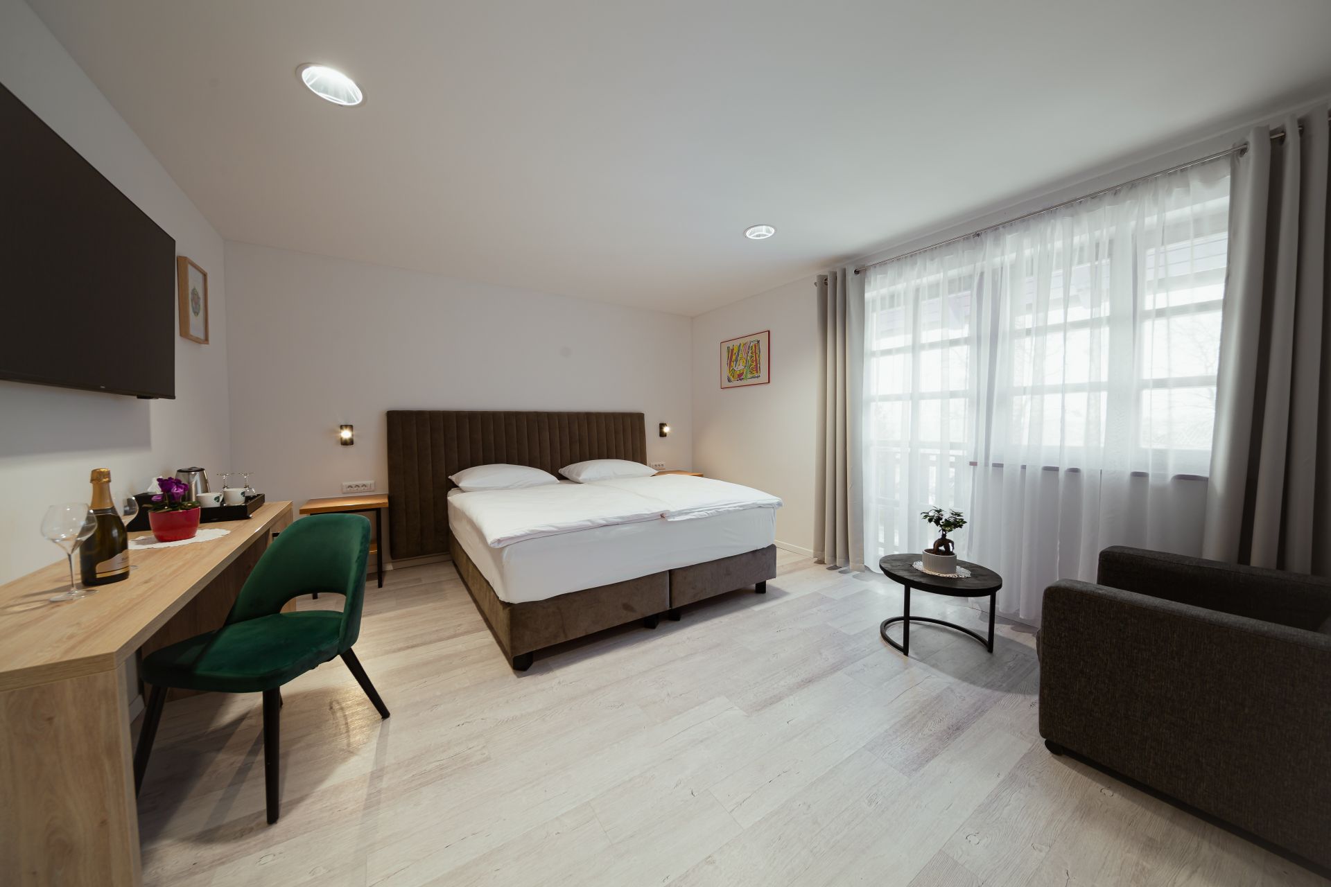 25m2Zakonska postelja 180x200Francoski balkonLCD TV, wi-fi, klimoKopalnico z wc-jem, tušem, sušilcem za lase in osnovnimi higienskimi pripomočki.