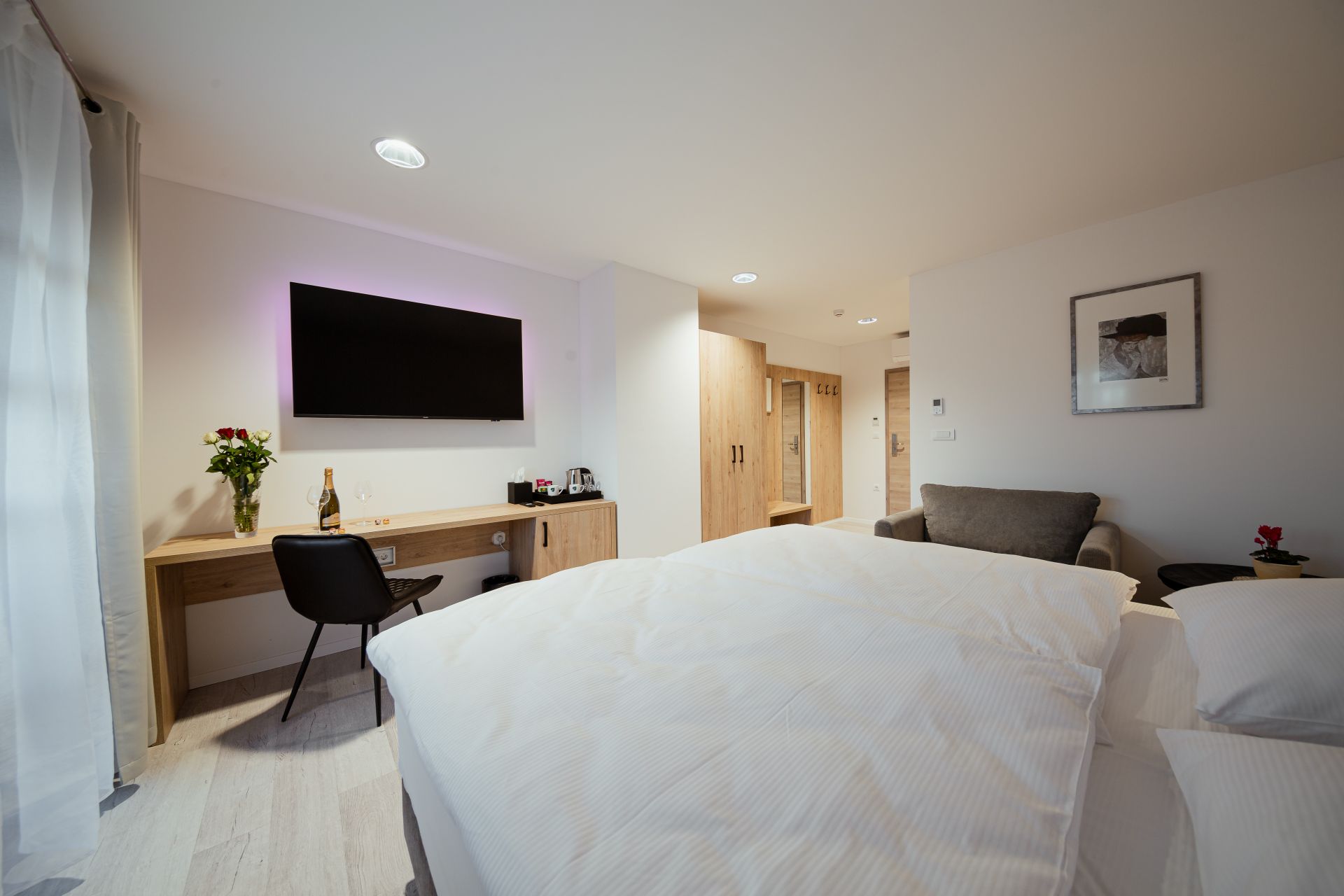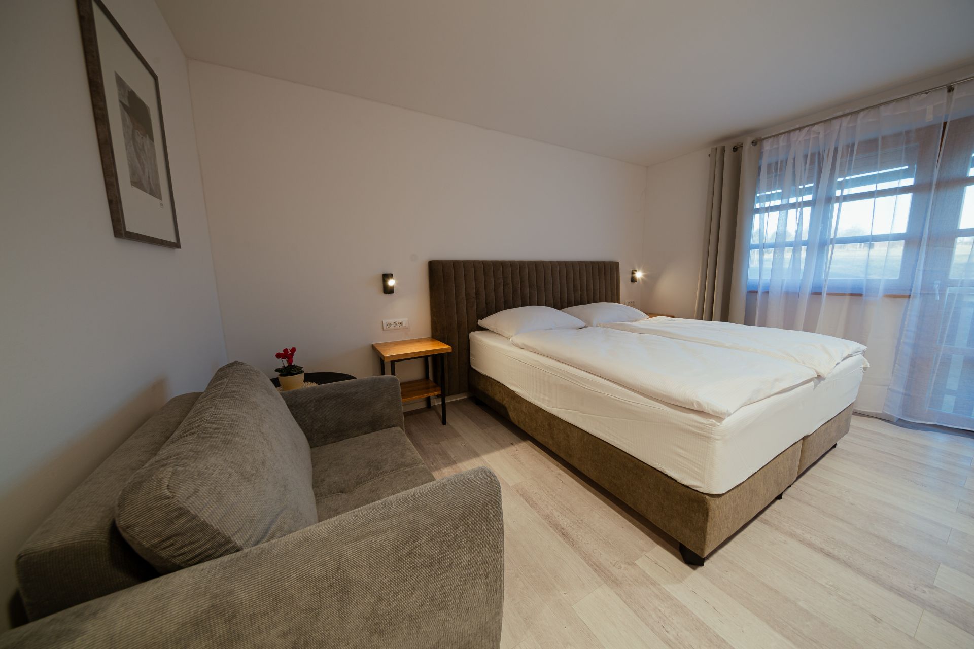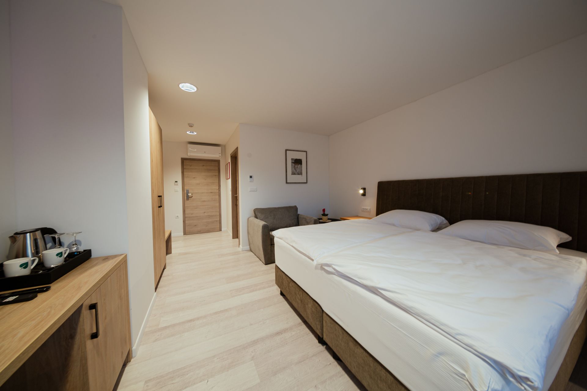 27m2Zakonska postelja 180x200Francoski balkonMožnost enega dodatnega ležiščaLCD TV, wi-fi, klimoKopalnico z wc-jem, tušem, sušilcem za lase in osnovnimi higienskimi pripomočki.