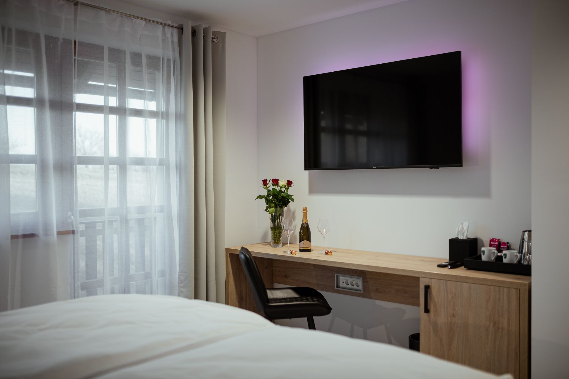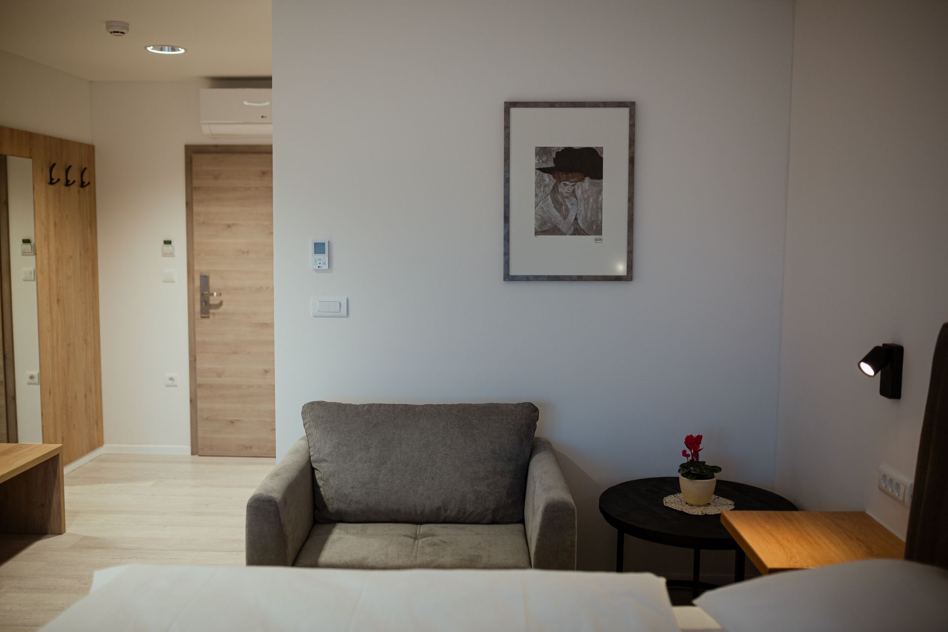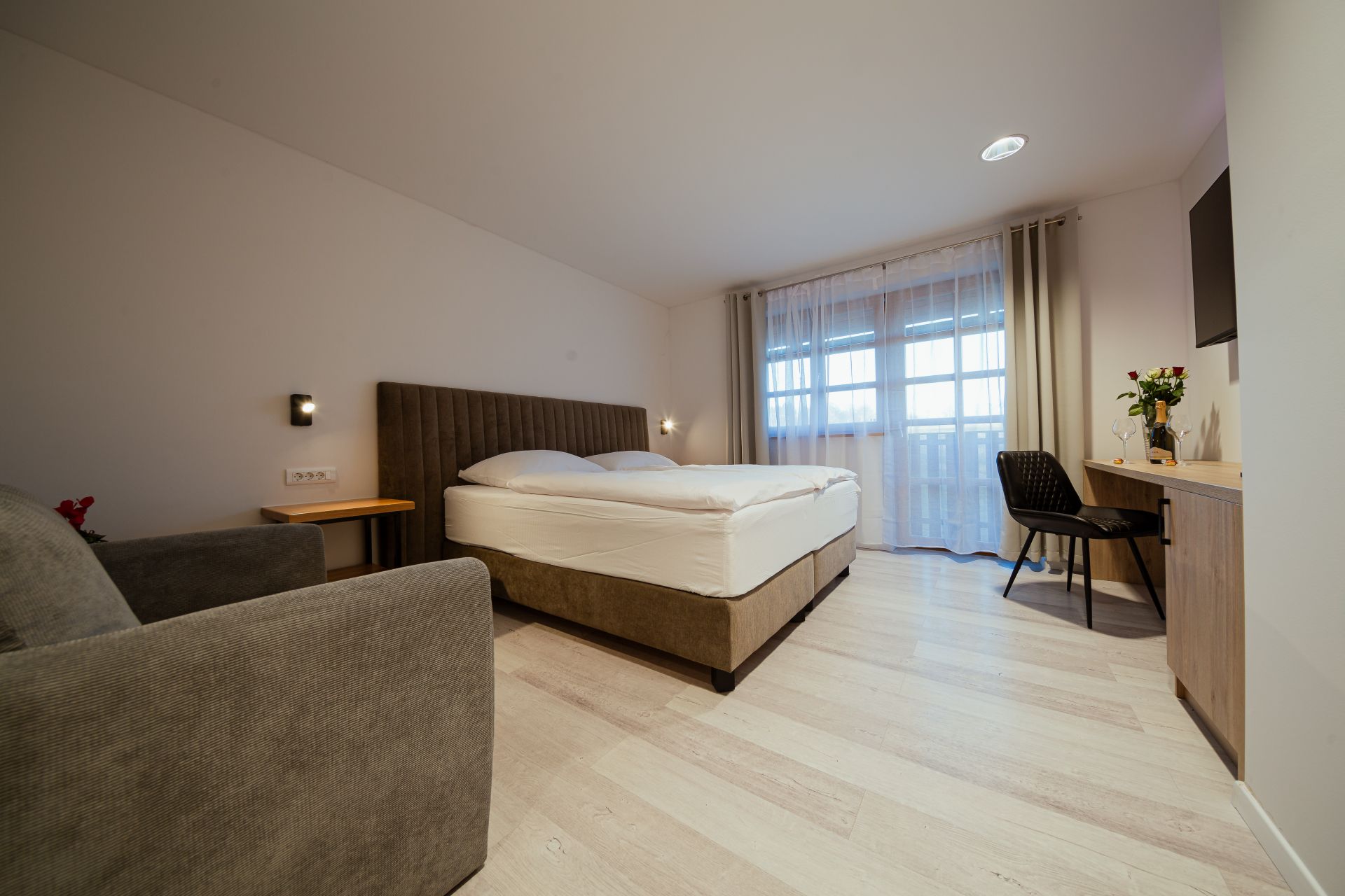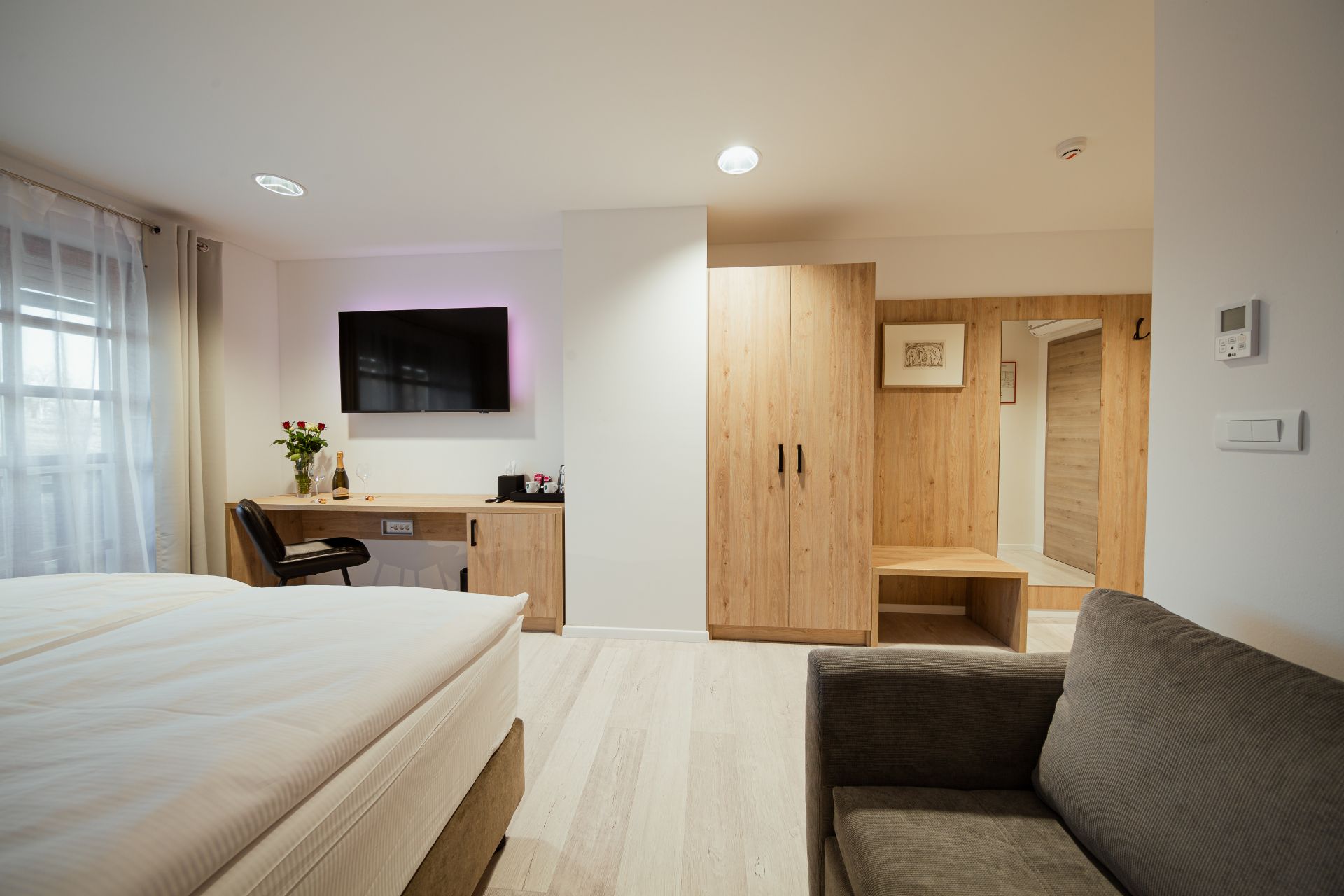 27m2Zakonska postelja 180x200Francoski balkonMožnost enega dodatnega ležiščaLCD TV, wi-fi, klimoKopalnico z wc-jem, tušem, sušilcem za lase in osnovnimi higienskimi pripomočki.