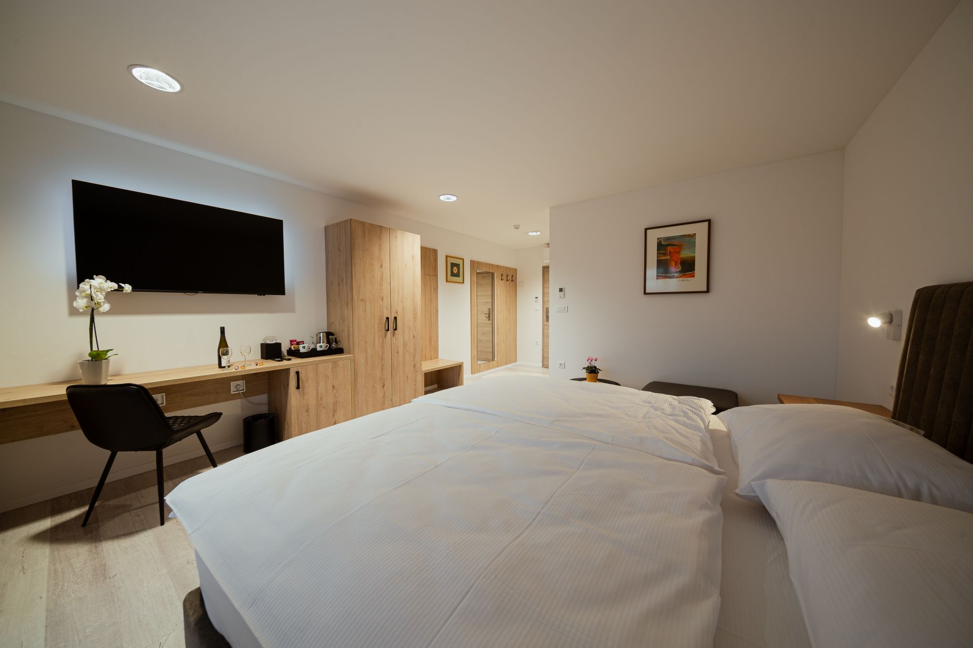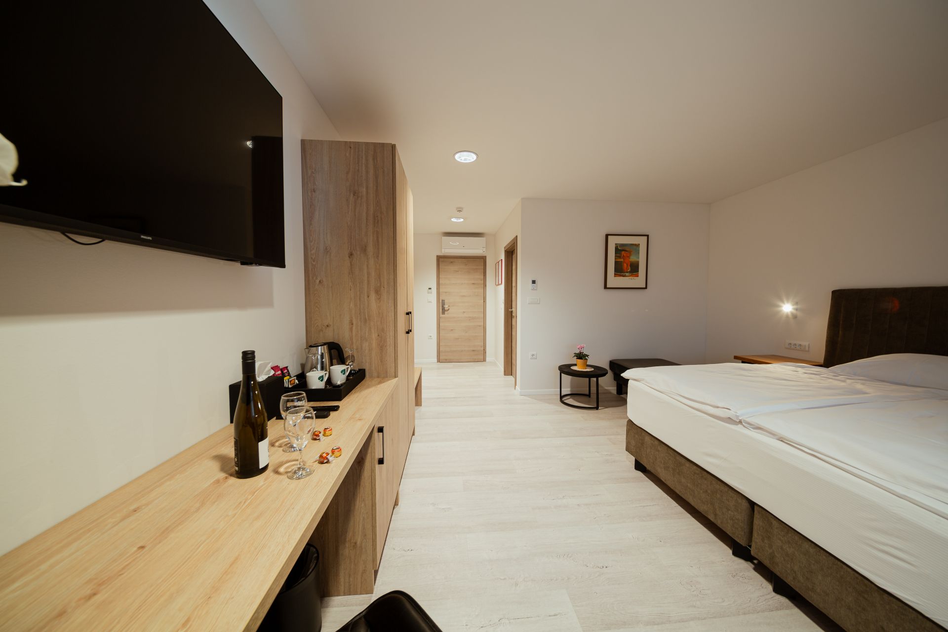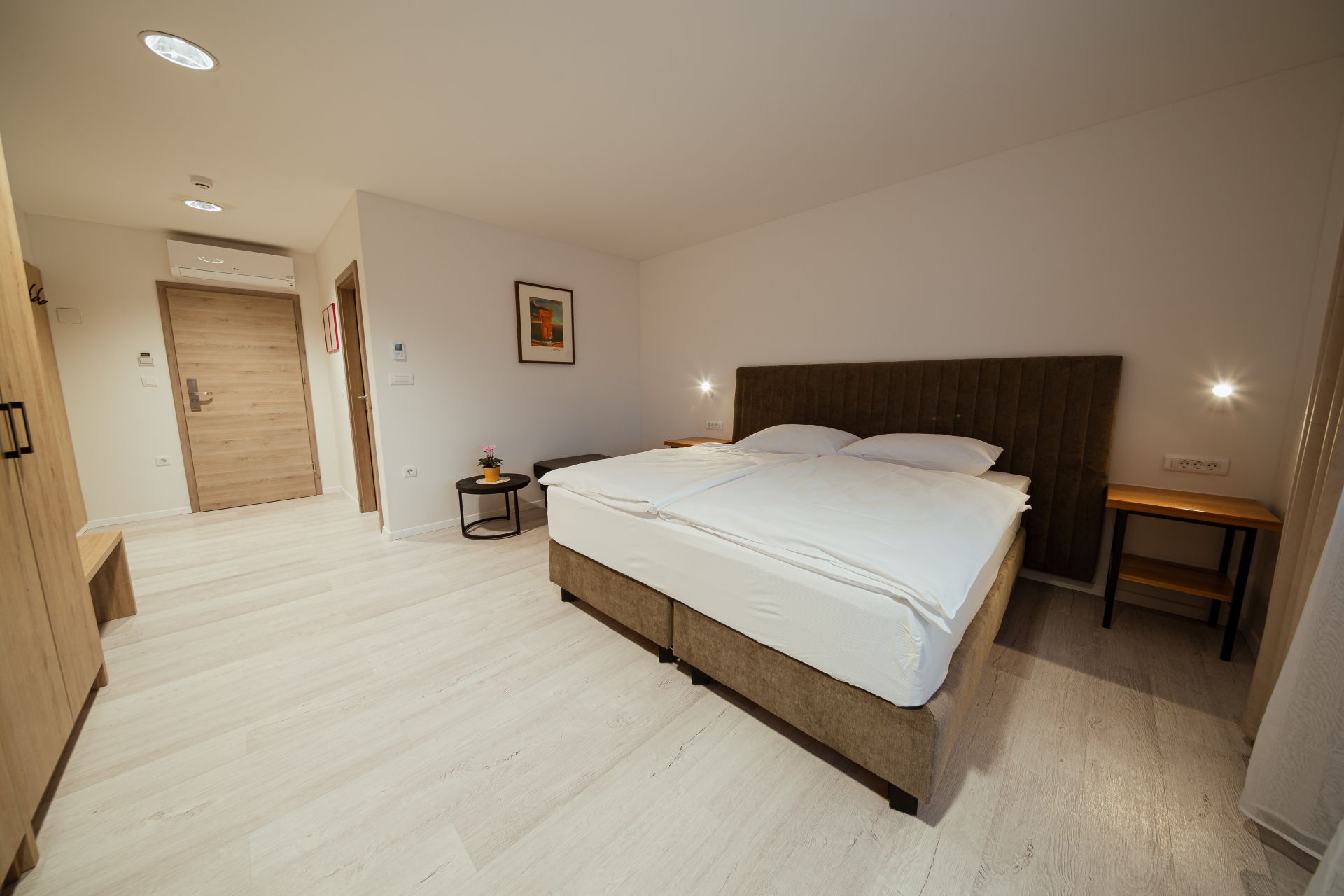 27m2Zakonska postelja 180x200Francoski balkonMožnost enega dodatnega ležiščaLCD TV, wi-fi, klimoKopalnico z wc-jem, tušem, sušilcem za lase in osnovnimi higienskimi pripomočki.